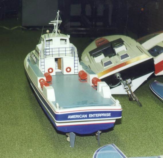 Den del där vi tillbringar längst tid under vår rundvandring är prototyphörnet. Ritningsunderlagen för ”mina” modeller granskas och J berättar om efterforskningar och ursprung. Han fick syn på en bild av Mister Darby i en tidning, och tyckte hon såg mäktig ut. Varvet, Halter Marine i New Orleans, kontaktades och J reste dit. Med sig tillbaks hade han inte bara de erforderliga underlagen för Mister Darby, utan också för American Enterprise. Hon var ett experimentbygge, avsedd att frakta personal och förnödenheter till oljeplattformarna utanför Louisianas kust. Bara drygt 15 meter lång och utrustad med tre vattenjet-aggregat, varav ett gasturbindrivet, var hon grymt snabb. En djupt V-bottnad offshore racer med passagerarutrymme. J berättade att han blev förälskad i hennes linjer och omedelbart bestämde sig för att göra en modell. Bristen på fungerande vattenjetaggregat vid den tiden tvingade fram valet av vanliga propellrar för modellen. Efter ett decennium som arbetsbåt i mexikanska golfen fick American Enterprise en mindre passagerarkabin bakom originalhytten och ett nytt liv som utflyktsbåt från San Diego i Kalifornien ner längs den mexikanska stillahavskusten. Jag såg henne i San Diego någon gång under 80-talets senare hälft. I mitt byggrum under en massa färgburkar ligger en broschyr om hennes dagturer till Ensenada. Och byggsatsen ligger som sagt på hyllan sedan jag köpte den 1985. Dags att ta fram? Tre vattenjetaggregat varav minst ett med förbränningsmotor, frikoppling, elstart och vattenpump för kylning? Skulle definitivt ta begreppet ”skalamodellbåt” till områden där vi i dagsläget inte rör oss. Ritningarna från Halter Marine möjliggör ett F2 bygge. Intressant, men projektkön är ganska lång.....