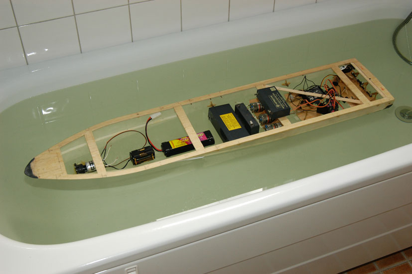 Motorerna monterades, rodermanövreringen byggdes, radioutrustningen fästes på en bädd, drivbatteri och mottagarbatteri lades löst i skrovet, och Vaxö var färdig för ett första trevade test i sitt rätta element. Först ett flyttest i badkaret. Det visade att jag hade en marginal på drygt 1,1 kg för rätt vattenlinje. Det måste räcka för överbyggnaden och övrig teknisk utrustning. Lite knappt, men går förhoppningsvis. I värsta fall kan jag vinna drygt 100 g genom att använda en BEC-krets i fartreglagen istället för mottagarbatteri, och ytterligare nästan 200 g genom att ersätta det planerade 3300mAh NiMH drivbatteriet med Litium.