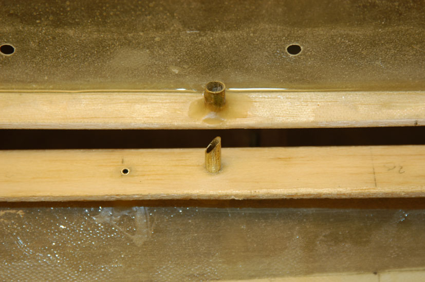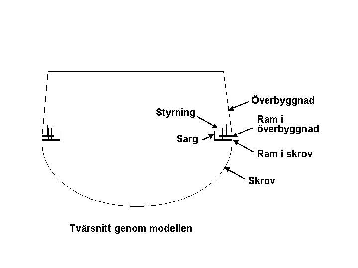 Jag plockade fram det skal till överbyggnaden som beskrivs i rapport nr 2. För att ge stadga, och för att kunna fästa överbyggnaden mot skrovet, fick överbyggnaden en ram i nederkant likadan som den ram i överkant av skrovet som också besktivs i rapport 2. Jag skulle inte limma överbyggnaden mot skrovet. Den ska gå att ta den. Däremot måste den dels ha exakt passform mot skrovet, dels komma i exakt samma läge varje gång man sätter dit den. Överbyggnadsramen gjordes smalare än skrovramen och en sarg i innerkant på den senare ska hindra eventuellt stänkvatten som kommer in mellan ramarna från att rinna in. För att styra överbyggnaden så den kommer i rätt läge gjorde jag fyra styrningar i form av 4/3 mm ytter/innerdiameter rör som limmades fast i skrovramen. Motsvarande rör fast en dimension större, 5/4 mm, limmades in i överbyggnadsramen. Jag fasade topparna på rören i skrovramen så överbyggnaden lätt skulle hitta sitt läge när den sattes på.