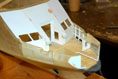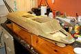 skrovet i rätt läge. Plywoodskivor håller överbyggnadens sidor plana medan epoxin härdar.