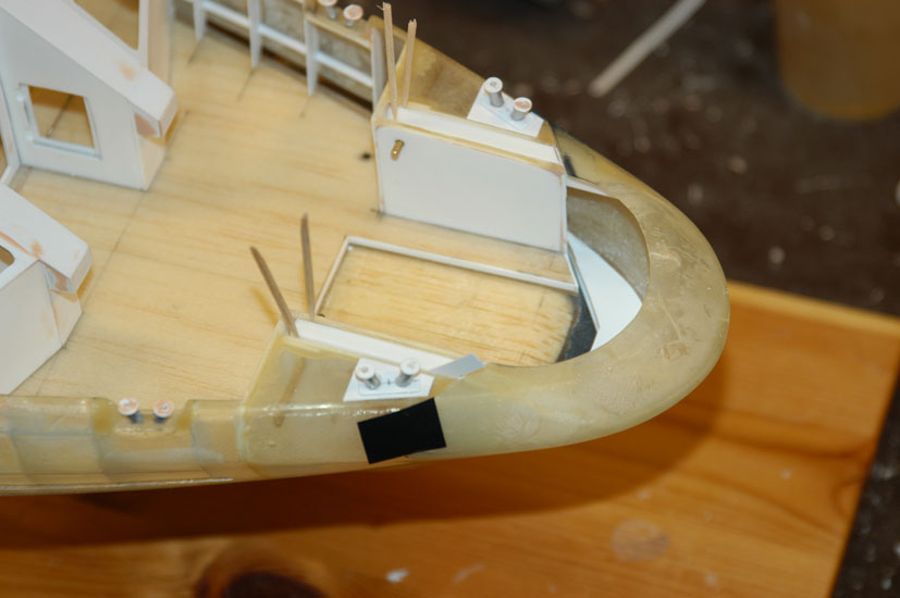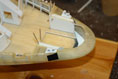 Nästa steg i bygget var bogvisiret. Den kapade främsta delen av överbyggnaden, som nu skulle vara bogvisir, var lite för liten. Sågen hade tagit bort ett ganska brett spår när jag kapade fören och dessutom skulle visiret i framkant gå ned en bit under däckslinjen. Det löste jag genom att pressa ned visiret i formen överbyggnaden laminerats i, förlänga formen ”nedåt” med vaxpapper. och lägga på lite mer epoxi i visirets bakkant och underkant. Därefter slipades visirets kanter till bra passform. Istället för att göra visiret färdigt och därefter passa in det gjorde jag tvärt om. Först byggde jag balkarna visiret skulle sitta på och deras infästningspunkter (bild 1), därefter tejpades visiret i rätt läge och limmades mot balkarna (bild 2).