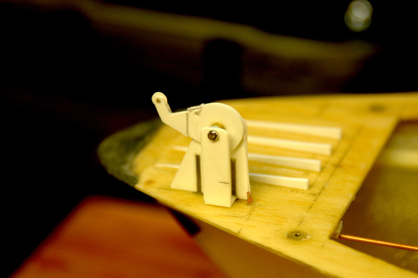Lösningen blev en lin-manövrerad hävarm monterad på skrovet, som sticker upp under en av visirets balkar och lyfter den (bild 4). Hävarmen manövreras via en lina från ett servo inne i skrovet.