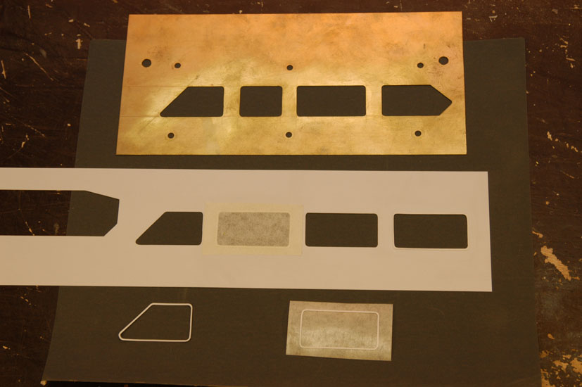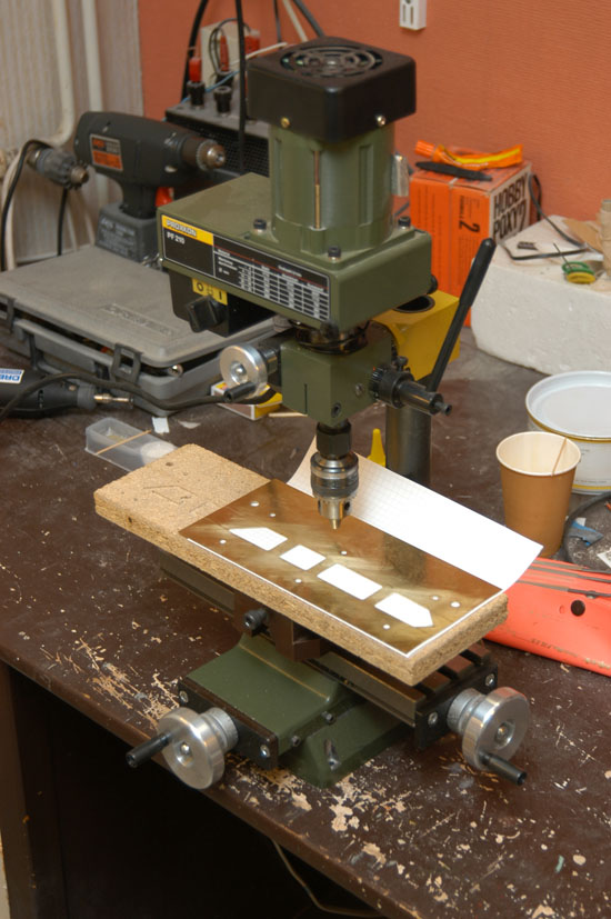 Jag lånade hem en fräs med ett bra koordinatbord. Med den fräste jag en mall i mässingsplåt för de fyra olika fönstertyperna (bild 6).