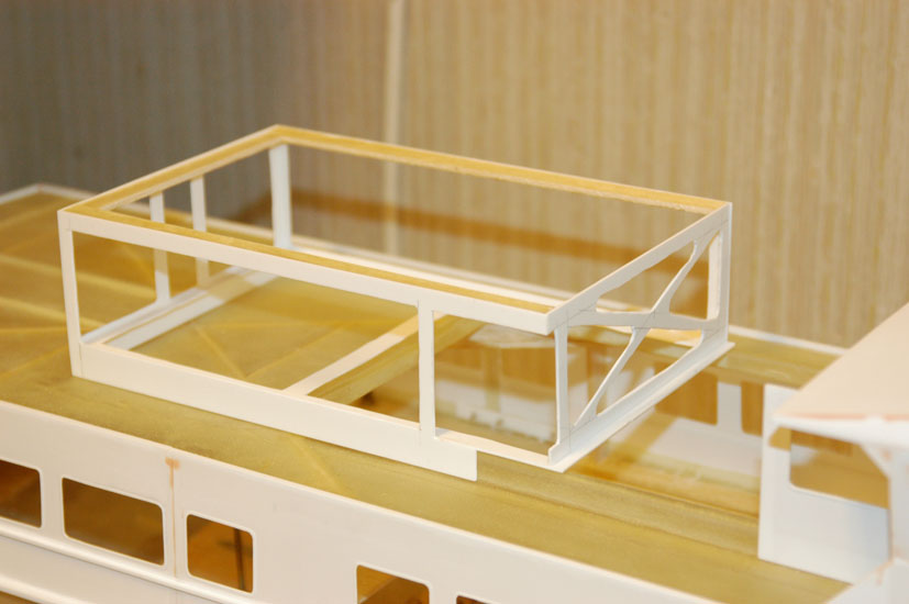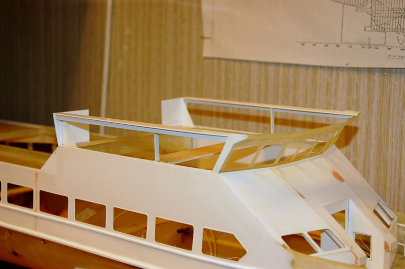 Ett skelett gjordes i 1mm styren (bild 13) och kläddes sedan med 0,25mm (sidor) och 0,4mm (tak) styren. Fönsteröppningar och ramar gjordes med samma metod som för huvuddäck. Taket fick förstärkningar på undersidan i balsa/glasfiber/epoxi laminat för att kunna bära masten. De lutande ”sargerna” ovanpå taket monterades och V-båtarnas karakteristiska profil började bli ganska tydlig (bild 14).