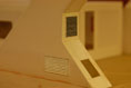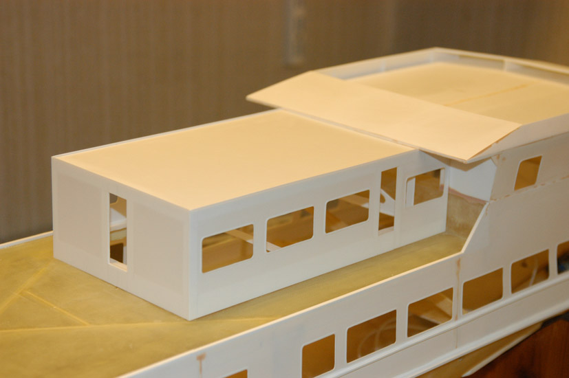 En stomme för däckssalongen (som ska vara lätt dentagbar för batteribyte etc) tillverkades i 1mm styren (bild 15). Den kläddes med tunna styrenark och passades in på sin plats (bild 16).
