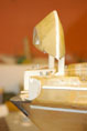 Öppningsmekanismen för visiret var en utmaning. De ”skåp” på fördäck som rymmer mekanismen på originalet är för små och har för dålig åtkomlighet för att rymma någon bra lösning. Enda förbindelsen med resten av överbyggnaden är det 2mm tjocka däckslaminatet (bild 3). Att gömma någon mekanisk överföring där skulle bli komplicerat.