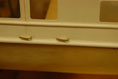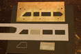 Med hjälp av mallen skar jag ut fönsteröppningarna dels ur de styrenark som skulle bli överbyggnadens sidor, dels ur lösa bitar som skulle bli fönsterramarna. På ramarna skar jag sedan (de raka sidorna) och klippte (hörnen) ytterkanten på ramarna så de blev en knapp millimeter breda. För att montera ramarna använde jag en typ av monteringstejp som används vid montage av skylttexter etc. Den finns t ex på SystemText i Stockholm. Ramarna monterades på tejpen som sedan fästes på styrenarket i rätt läge över fönsteröppningen. Därefter penslade jag flytande lim längs fönsterkanten från baksidan och drog bort tejpen. Bild 7 visar de olika stegen i ordning från vänster; 1 (utskuren ram), 3 (ramen på monteringstejpen), 2 (tejpat på rätt plats), 4 (ramen färdigmonterad).