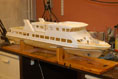 Massor av arbete återstår naturligtvis. Bland annat ska modellen ha närmare 40 dörrar och luckor, alla öppningsbara. Många av dem ska sitta på olika små skåp och boxar som jag inte börjat med än. Exempel på andra omfattande arbeten som återstår är masten, relingen på övre däck, soffor och livflottar, all belysning, för att inte prata om ytbehandling/målning. Arbetet med smådetaljer tar alltid mycket tid, och kommer här att bli extra besvärligt eftersom det inte får väga någonting. Jag har dock gott hopp om att klara vikten. Modellen som den står på bild 19 och 20 väger nästan exakt ett kilo. All teknisk utrustning som ska i väger knappt 900 gram . Jag har alltså ett halvkilo kvar för alla detaljer och ytbehandlingen. Det bör gå. I värsta fall kan jag reducera de 900 grammen för tekniken med nästan 300 g genom att gå till litiumbatteri och borstlösa motorer. Vi får se om det behövs.