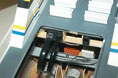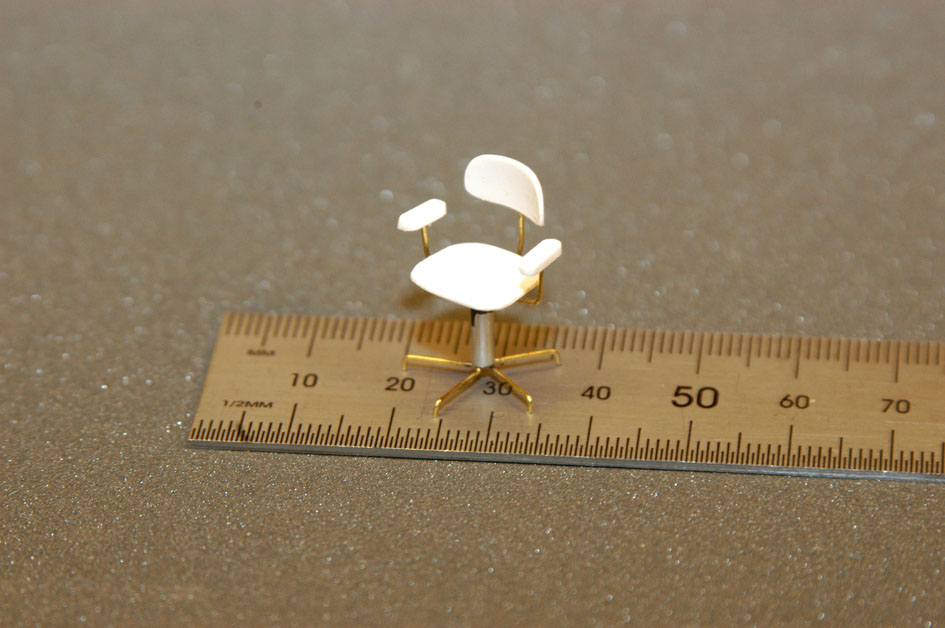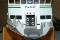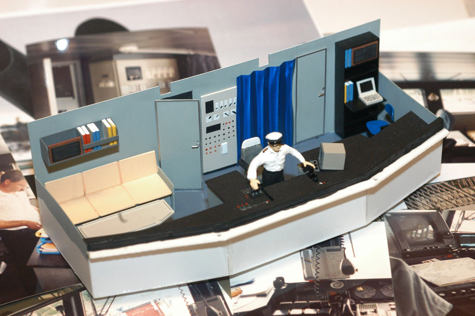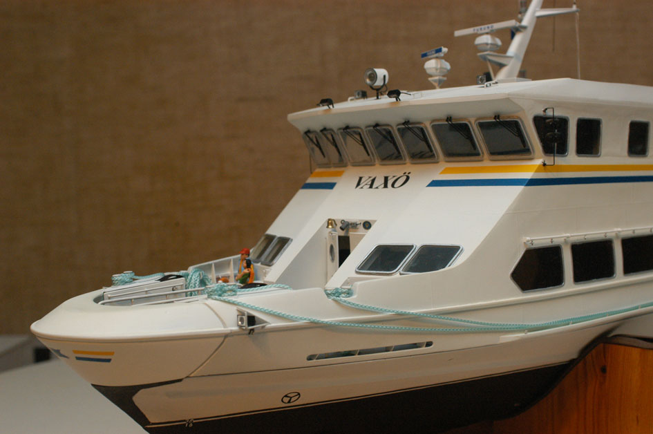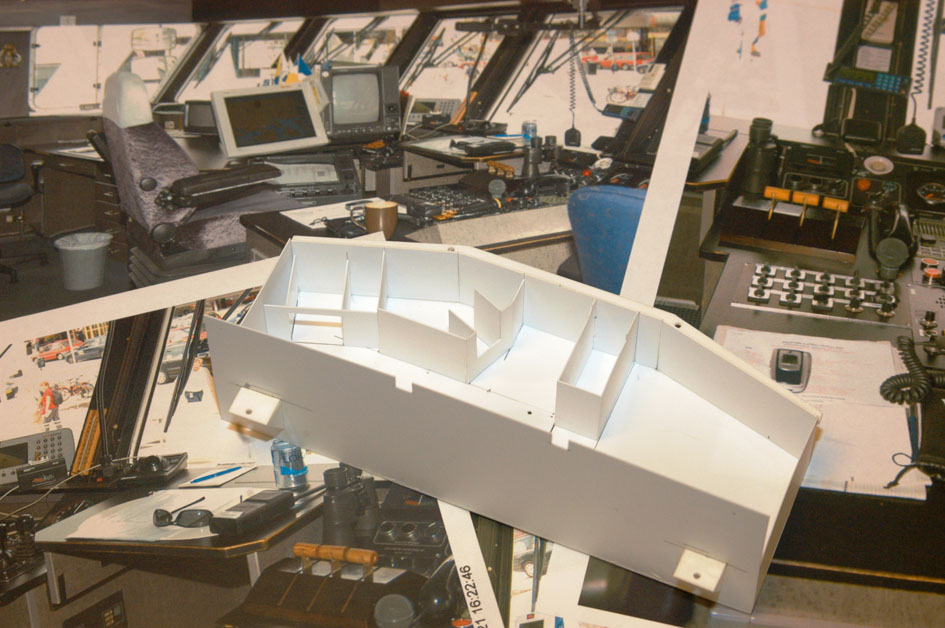 Dags att ta fram den ”balja” för kommandobryggan jag gjorde när jag byggde överbyggnaden (byggrapport nr. 5). Här hade jag medvetet gjort en förenkling. Egentligen skulle en sektion i mitten av bakväggen på bryggan gå ca en cm längre bak. Det hade jag avstått från för att kunna göra en stark infästning för masten, som står rakt över den sektionen. Det känns fortfarande som en klok eftergift. Layouten för bänkar och konsoler fanns på ritningen. Det var bara att bygga upp i styren (bild 1). I allt övrigt följde jag det stora antal bilder jag tagit vid två tillfällen. En uppsättning bilder från mitten av 90-talet visade utrustning och färgsättning under Vaxös tidiga år och tjänade som huvuddokumentation. En annan uppsättning mer detaljerade bilder tagna 2005 gav ytterligare information om den utrustning som fortfarande var kvar från de tidiga åren. De olika detaljernas mått tog jag fram genom att syfta på bilderna. En gammal laptop PC från 1994 och arbetsstolen i min hobbyverkstad fick också ställa upp som förlagor för måttagning (bild 2). Skepparen är byggd av modifierade delar från generalerna Eisenhower och Macarthur i Tamiyas sats Famous Generals i 1/35. Andra delar från satsen ingår i andra figurer ombord. Att skepparen står upp, med högerhanden vid de tre gasreglagen och vänsterhanden vid de två joysticken för roder och bogpropeller, tyder på att han är mitt i en tilläggningsmanöver. Bryggan blev nästan en modell i sig och var nu klar att monteras in i överbyggnaden (bild 3).