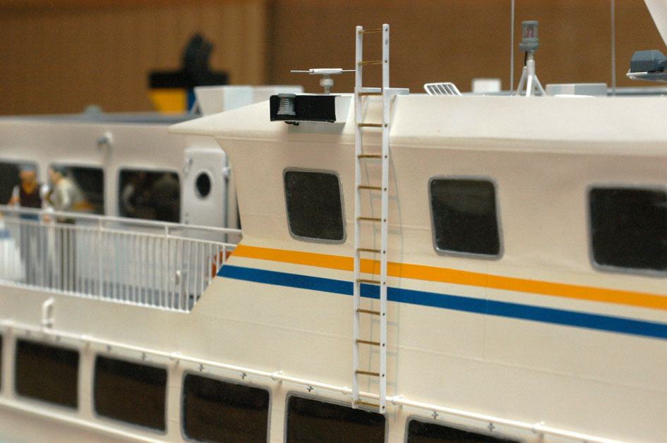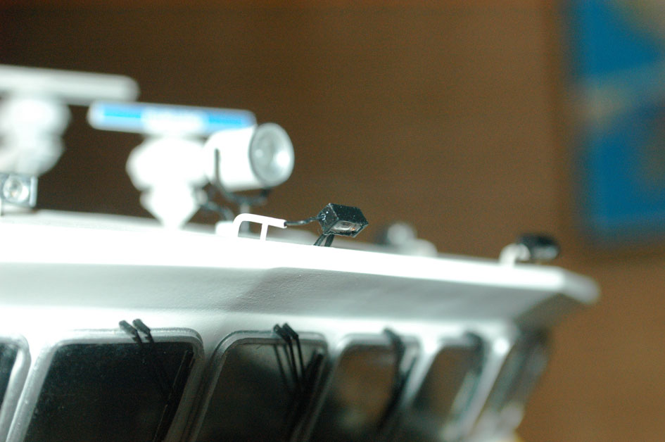 Ett par detaljer återstod att bygga innan det var dags för elsystemet. Den ena var fyra identiska lampor varav två skulle sitta på taket och lysa upp fördäck och de andra två på skorstenarnas utsida för att lysa upp Waxholmsbolagsemblemen. Jag hade fått tips om några mikrolampor som Kjell & Company sålde. De var väldigt tilltalande i storlek, men visade sig ge så dåligt ljus att de inte fyllde någon annan funktion än att markera att de var lampor. Jag använde istället 2 mm glödlampor liggande i en 3 mm u-profil i mässing, med gavlar i styren och reflektor av krom-folie (bild 4). Den andra detaljen var drivmotorerna för radarantennerna (bild 5). En monterades under kommandobryggan och driver sin antenn via en rak 0,5 mm mässingstråd. Den andra sitter i vinkel på mastinfästningen och driver sin antenn via en 0,5 mm pianotråd som går i en båge upp genom ett stag i masten. På det sättet kunde jag undvika synliga axlar eller stag som inte finns på originalet (bild 6 och 7).