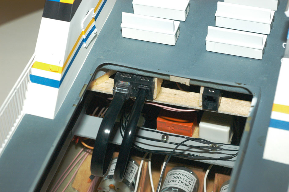 Alla funktioner listade ovan utom signalen sitter i överbyggnaden. Det var alltså 36 olika strömförbrukare som skulle kopplas ihop i 9 individuellt styrda kretsar och sedan kopplas över från överbyggnaden till skrovet med någon säker och lätt isärtagbar koppling. En av kretsarna, däcksbelysningen, skulle också kopplas vidare till däcksalonghuset. Jag brukar normalt försöka göra relativt ”snygg” ledningsdragning och använda skruvplintar för att underlätta senare isärtagning för eventuella uppgraderingar eller reparationer. Här valde jag dock metoden ”råttbo” och frihängande lödningar med krympslang (bild 8). Motivet var att spara vikt. Plintarna eliminerades och ledningarna blev lite kortare. I en lödd kabelhärva är det också lättare att gå in efteråt för reparationer eller ändringar om inte alla ledningar ligger hopstrappade i klump. För kopplingen mellan modellens olika delar använde jag modulkontakter från data/telekom världen (bild 9). En åtta- och en sexpolig mellan överbyggnaden och skrovet samt en fyrpolig mellan överbyggnad och däcksalong. Modulkontakterna är små, lätta, och oerhört enkla att koppla ihop och isär. Mellan skrovet och överbyggnaden har jag kontakter i båda ändar av kablarna så jag kan ta bort dem helt när jag tar isär delarna för något underhåll.