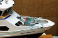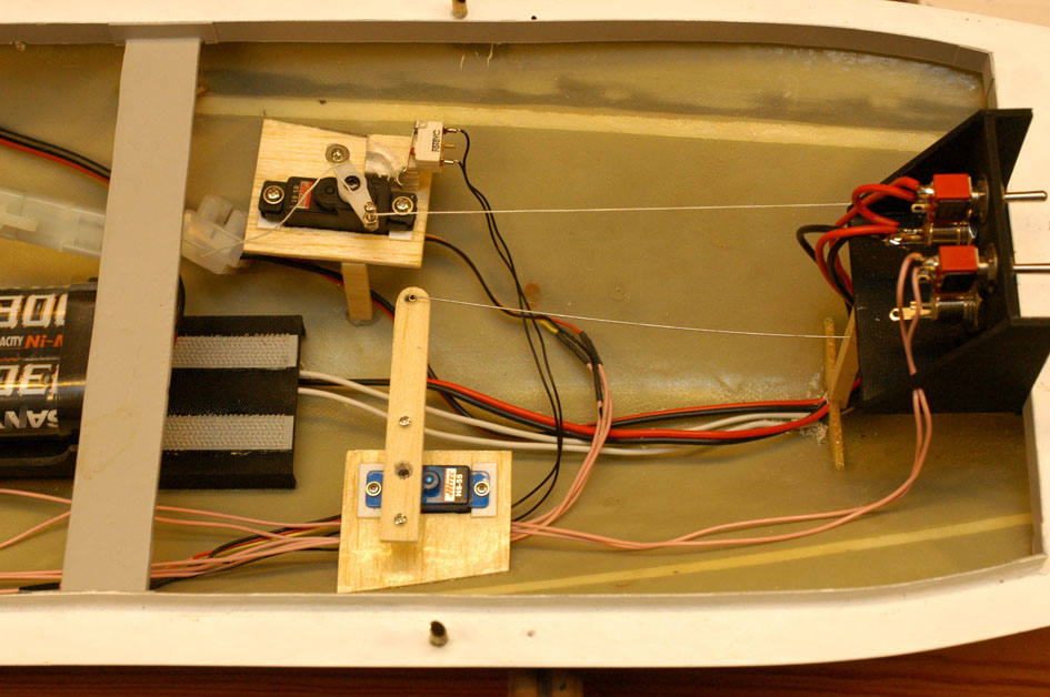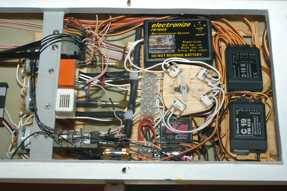 Bild 10 visar huvuddelen av ledningsdragningen i skrovet. Det är en kompakt mängd ledningar, främst mellan Nautic-modulen och modulkontakterna till överbyggnaden, direkt och via reläer. På balsa/glasfiber bryggan över drivmotorerna sitter, nerifrån och upp på bilden, ett laminat med spänningsregulatorn och de två reläerna för strålkastare framåt och bakåt, den sorgliga summern, reläet för däcksbelysningen, samt de 6- och 8-poliga modulkontakterna till överbyggnaden. Att reläet för däcksbelysningen är så stort jämfört med de för strålkastarna beror dels på att det ska hantera mer ström, dels på att jag här ville ha ett bistabilt relä. Ett sådant relä drar ingen manöverström annat än när det slås om, medan ett ”vanligt” relä drar ström hela tiden det är tillslaget. Då jag räknar med att däcksbelysningen kan vara påslagen långa perioder, till skillnad från t ex strålkastarna, ville jag undvika kontinuerlig strömförbrukning på det reläet.