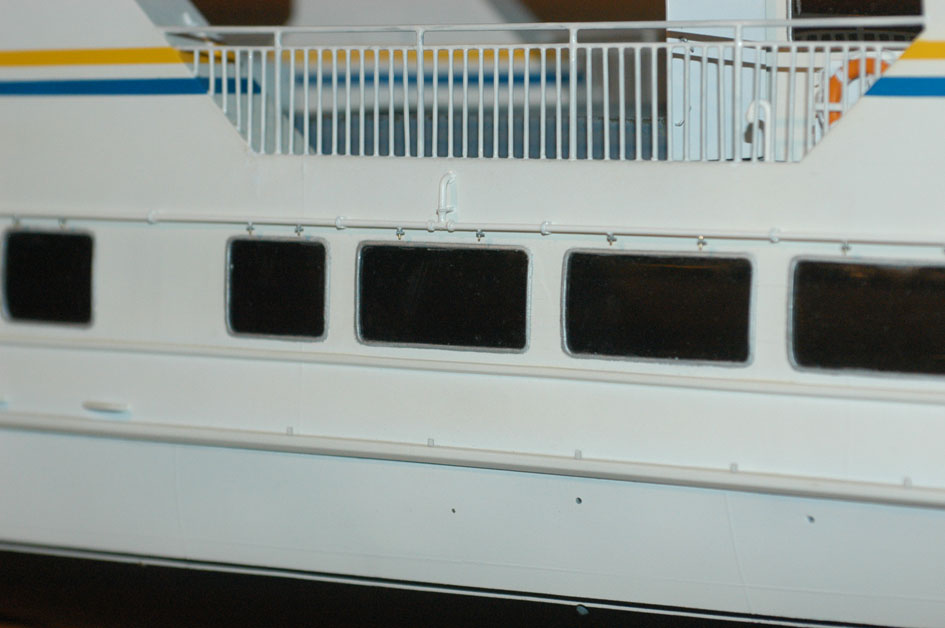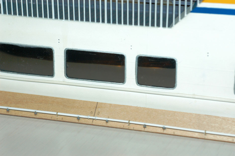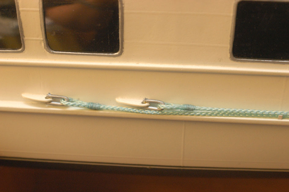 De små stöden som gör att förtöjningslinorna ligger kvar på avbärarlisterna i däcksnivån gjordes av 0,25x2mm mässing med pålödda stift av 0,5mm mässingstråd, där stiften går ner i borrade hål i avbärarlisten för att ge tillräcklig styrka. Det hela blev hyfsat likt originalet (bild 16 och 17). Bilden av originalet är tagen 2007 och bl a målningen i vattenlinjen och räcket på övre däck framför skorstenen skiljer sig från den tid modellen visar. Dessutom har ett par av stöden på avbärarlisten gått av på originalet (på babordssidan är alla kvar).
