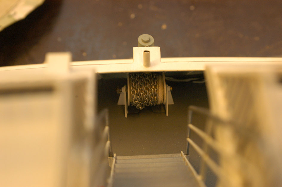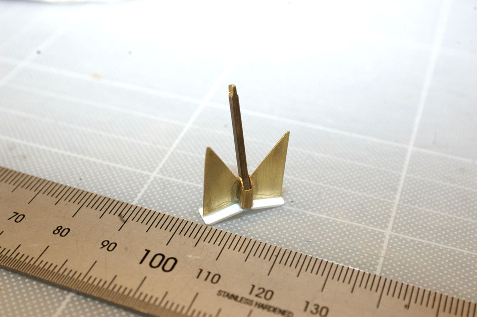 Trumman för ankarlinan/kättingen tillverkade jag för flera år sedan i samband med att jag inredde akterdäck. Den ska passa i uttag i två av stöden på insidan av bakväggen på akterdäck. Kanalen genom golvet på akterdäck och ut genom akterspegeln var också klar, delad i två sektioner eftersom akterdäck på modellen är en del av överbyggnaden och akterspegeln en del av skrovet. På originalet används en vev som kan fästas på trumman för all linda upp linan. Då akterdäck på modellen är så trångt har jag istället satt en 3mm mutter på trummans ena sida. Genom att trä in ett verktyg genom hålet för förtöjningslinor på akterdäck kan jag nå fram till muttern och linda upp linan. Om ankaret är hopkopplat med kättingen måste det tas bort varje gång jag ska lyfta bort överbyggnaden från skrovet, så tills vidare kommer jag nog att hänga ankaret på plats med en tråd och låta kättingen sluta i golvet på akterdäck. Utseendemässigt är det ingen skillnad. Ankartrumman är byggd av ett aluminiumrör med sidor av styren. Ställningen är av styren med lager och axel av mässing. Ankaret är i huvudsak av mässing med lite styren (bild 18 och 19).
