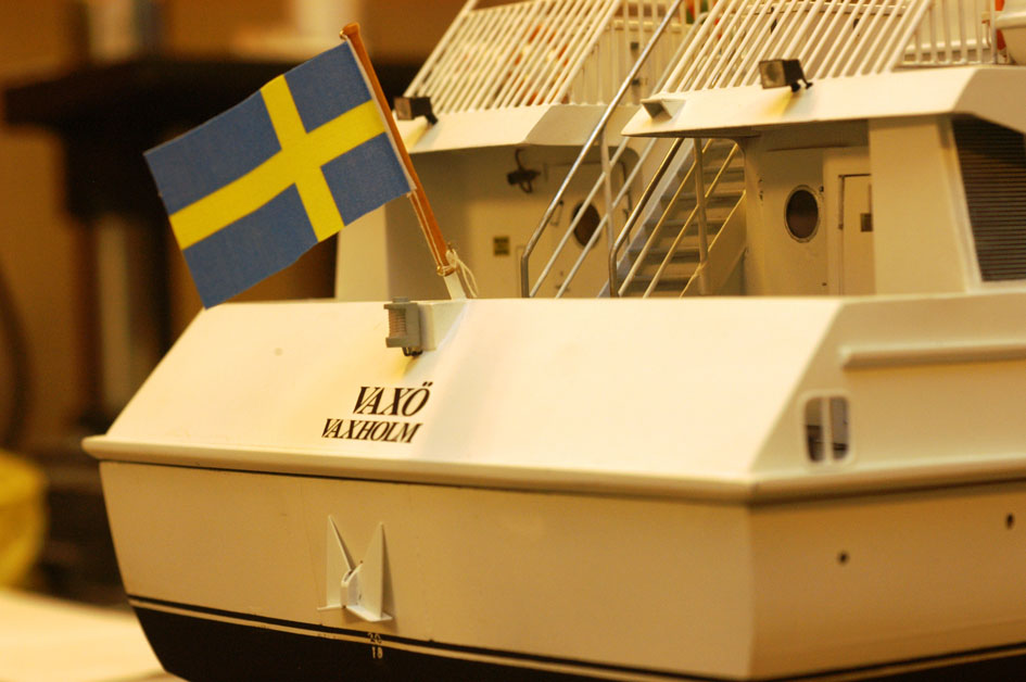 Någonstans under vintern kom också flaggorna på plats. I aktern en färdigköpt svensk och i masten rederiflaggan som dekal gjord på datorn (bild 26 och 27). Intrycket av den senare under sommaren får utvisa om jag ska lägga ner jobb på en textilflagga.