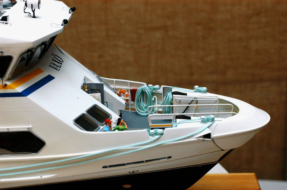 Linorna fästes i sina öglor på överbyggnadens sidor med ”schackel” gjorda av 1,5mm mässingsstång med sprintar av 0,5mm mässingstråd (bild 22). Därifrån ligger de på avbärarlisterna fram till fördäck där de är fästa i knapar med resten av linan upplindad och hängande på krokar, redo för förtöjning (bild 23). Linorna fungerar utmärkt för att förtöja modellen på samma sätt som originalet, men att linda ihop dem efteråt och hänga upp dem på fördäck så det blir någorlunda snyggt är ett pillerjobb.