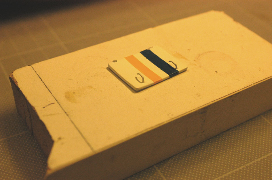 Allt som innebar jobb inne i överbyggnaden (till den dag något behöver repareras eller jag bestämmer mig för att installera innebelysning) var nu klart. Fönsterspolningsutrustningen på huvuddäck stod i tur. Den byggdes upp av 1,5mm styrenstång och 0,5mm mässingstråd på en jigg av en plywoodribba (bild 15). Jiggen användes också för att borra hålen i överbygganden, vilket gav perfekt passning. I alla fästpunkter och på alla munstycken sitter också små tillskurna kvadrater respektive trianglar av 0,25mm styren. De skruvade skarvarna på rören på originalet simulerades med tunna ”skivor ” av styrenrör i en grövre dimension.