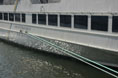 Nu var tiden mogen för förtöjningslinorna. Originalets linor är ljusgröna, har en påtagligt syntetsisk ”look” och är knappt 30 mm i diameter. Jag inte sett någonting från någon hobbyfirma som ens kommer i närheten. Utöver att ha rätt utseende måste linan också vara oerhört flexibel då den av sin egen tyngd ska ligga platt på avbärarlisterna en sträcka på cirka en halvmeter. Jag började hålla ögonen öppna efter en passande lina i stort sett direkt efter att jag bestämde mig för bygget, för snart 15 år sedan. Några år senare hittade jag ett så kallat murarsnöre (att använda och sikta efter när man murar) som var relativt bra. Det plockades nu fram för att monteras på modellen. Ett veck på varannan decimeter, efter vindan linan varit lindad på, vägrade länge att räta ut sig. Veckor med vikter hängande i linan gjorde det lite bättre, men inte bra. Lite försiktig behandling med värmepistol löste dock problemet. Marginalen mellan tillräcklig värme för att få bort vecken, men inte så mycket att linan började smälta och blev stel, var väldigt snäv men den fanns. Ett annat problem med linan kunde jag inte göra något åt. Den är ett par tiondelar för grov, men man kan väl inte få allt.