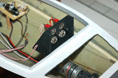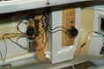 För att enkelt kunna slå på och av elsystemet, och även ladda batteriet utan att ta ur det, monterade jag två strömbrytare och två laddkontakter så de sitter direkt innanför entrédörrarna från fördäck (bild 11 och 12). Det är tveksamt om jag någonsin kommer att använda laddkontakterna då det är så lätt att lyfta på däcksalonghuset och ta ur batteriet. Strömbrytarna, en i batterikretsen och en kopplad till det fartreglage som innehåller batterielimineringskretsen för matning av radioinstallationen, är dock oerhört praktiskt att ha så lättillgängliga. Som det är idag skulle det naturligtvis räcka med en strömbrytare och en laddkontakt, men här är det förberett för att ha separat batteri för radion. Lite inkonsekvent med tanke på den nästan hysteriska viktjakten i övrigt, men vem har sagt att man måste vara konsekvent i alla led?