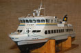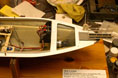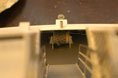 Nästa steg var kopplingen av landgången till servot som skulle skjuta ut och dra in den. Servona för bogvisiret och landgången sitter på var sin sida långt fram i skrovet (bild 20). Servot för bogvisiret manövreras med en vippströmbrytare på sändaren och har programmerats till ca 10 sekunders öppnings- respektive stängningstid. Landgången manövreras med en skjutpotentiometer på sändaren då det beror på förhållandena vid varje brygga hur långt den ska skjutas ut. I början hade V-båtarna en rulle i durken under landgången för att mata ut den. Det innebar att om bryggan var högre än däcket måste besättningen lyfta landgången mot bryggan. Var bryggan markant lägre än däcket kunde landgången också bli hängande på gummiläppen längst fram på skrovet och måste dras tillbaks för hand. Efter några år modifierades det till ett system där drivrullen sitter på en båge som kan höjas med hydralik. Men så fiffigt var det inte i början, och är inte på modellen. För att undvika risken att köra ut landgången i ett stängt bogvisir går matningen till landgångsservot via en mikrobrytare på bogvisirsservot, som bara är sluten när bogvisiret är helt öppet. En arm på servot och en pianotråd som går in i ett mässingsrör fram till landgången svarar för den mekaniska kopplingen (bild 21). Nu var allt klart för tilläggning.